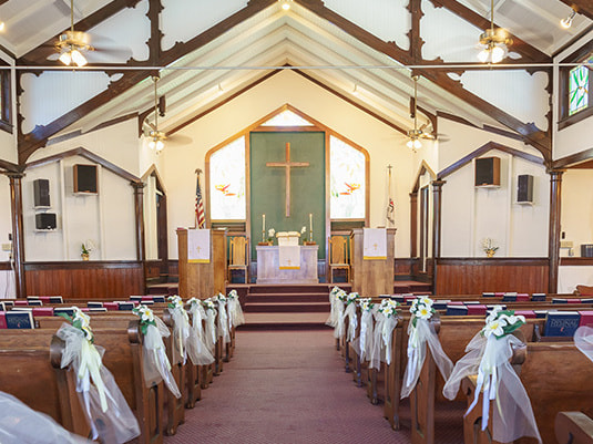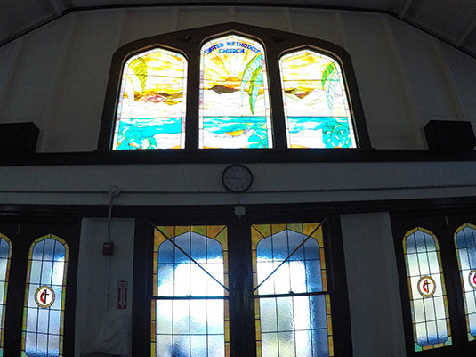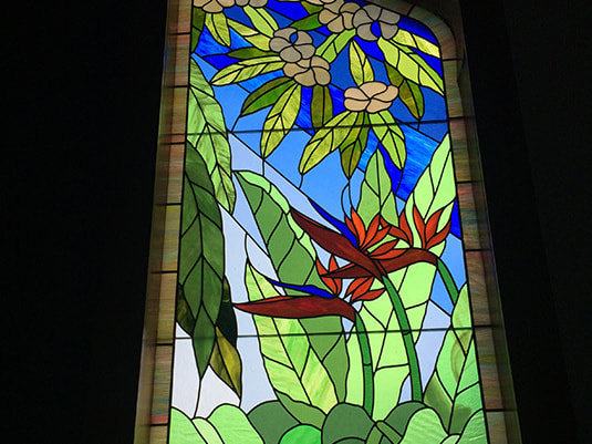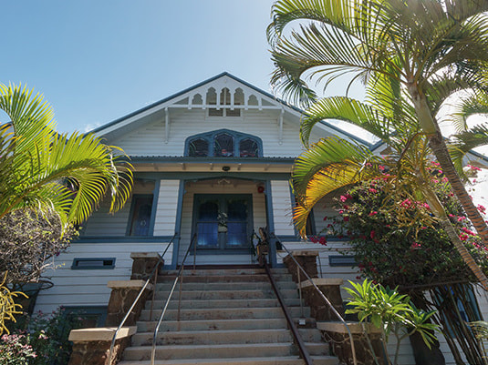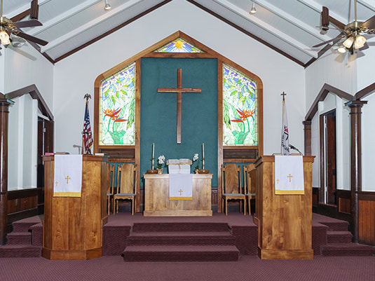 1896年創立で、ラハイナのノスタルジックな街並みにマッチする教会は日本人学校として使われ、1939年まで牧師先生はすべて日系人という日本人にゆかりのある教会です。教会の聖堂は2階になっており、エントランスから見渡す青い海、お庭には咲き乱れる南国の花々が美しいヨーロピアンテイストの美しい教会です。ラハイナの街の中心に建っているため、ホテルからのアクセスも良く、プルメリアや南国の花々とラハイナ=「灼熱の太陽」を象徴するような眩しい太陽のステンドグラスがお二人を迎えてくれます.