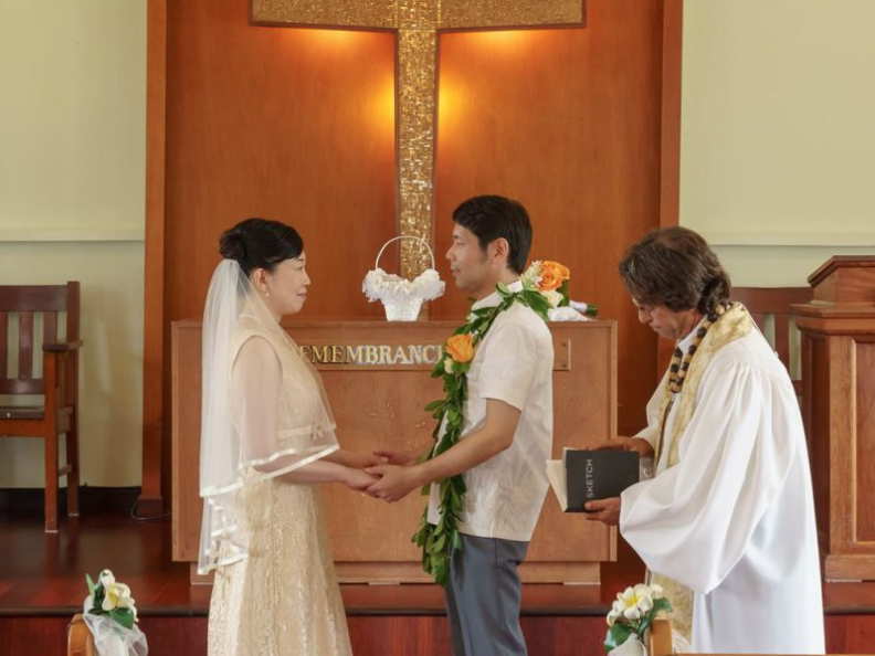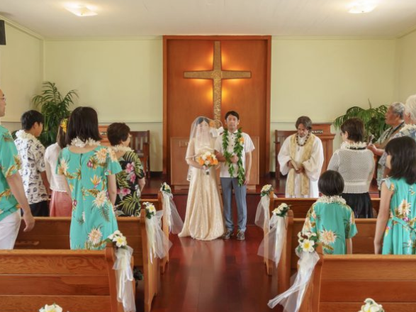 マウイらしい温もりの挙式なら、こちら。マウイ島で人気が高い地区、カアナパリから車で5分という好立地に建つ小さな教会は、1850年の設立以来、地元信者に愛され続けるチャーチ。白をベースにした聖堂内は、手入れがよく行き届き、信者ハンドメイドの金色モザイクの十字架も。挙式後には、目の前に広がる公園の芝生や海をバックに南の島らしいブライダルショットをお楽しみください。