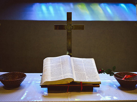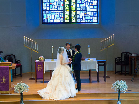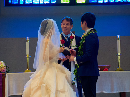 ハワイの太陽と海をモチーフにしたステンドグラスが輝くアットホームで心温まる美しい教会