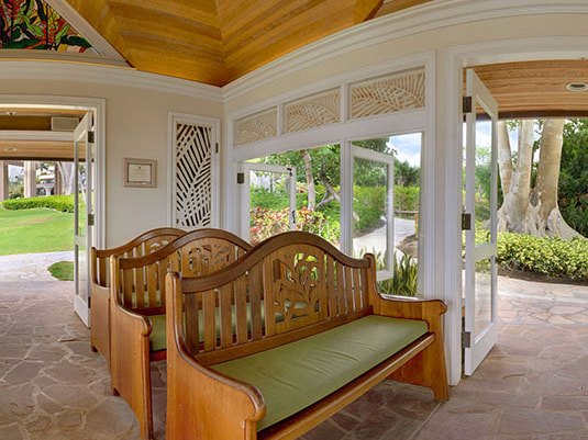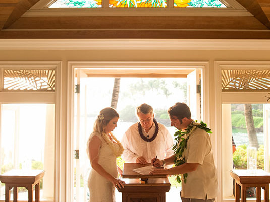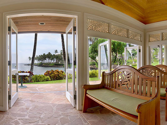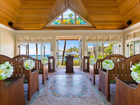 モノレールやボートが走りフラミンゴやイルカなど南国の野生動物たちがいるヒルトン・ワイコロア・ヴィレッジ内に佇む小さなチャペル。海を一望できる場所に建てられ、チャペル内は木のぬくもりに包まれ大きな窓が多いのも特徴。窓からは明るい光と潮の香りがハワイ挙式を演出します。