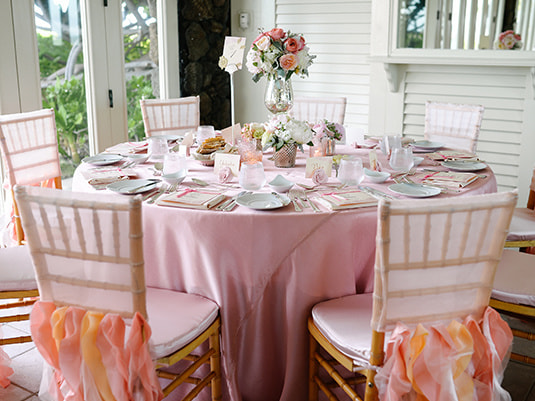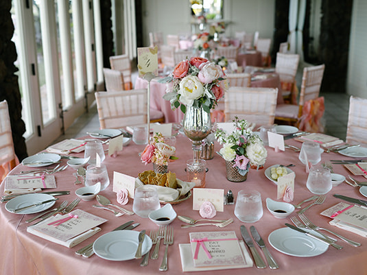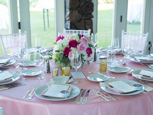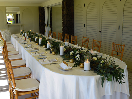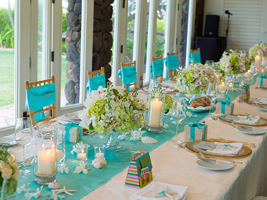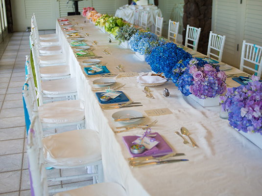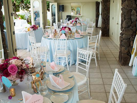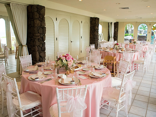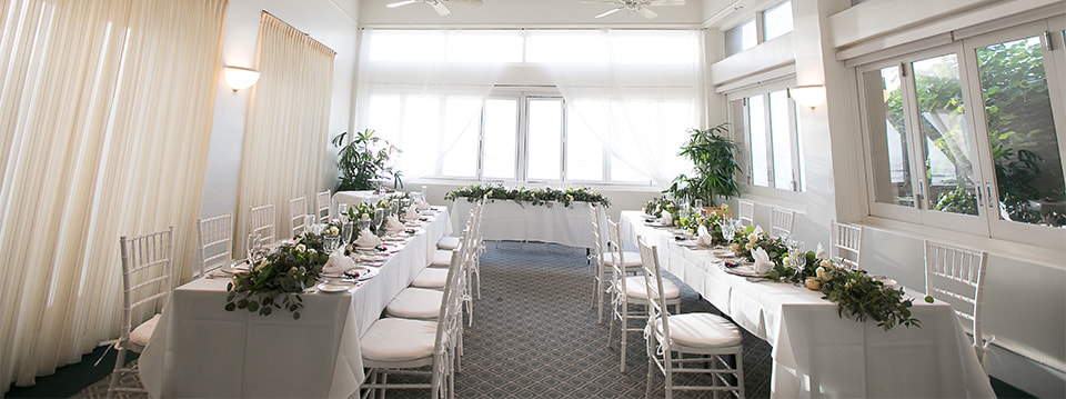 憧れの名門ホテル「ザ・カハラ」内にあるプライベートルーム。ホワイトで統一されたエレガントな雰囲気のルーム内は、海側の窓が全面オープンし真っ青な海と緑に萌える芝生のガーデンを一望できます。人数や希望に合わせてテーブルのレイアウトも自由自在。お庭にテントを張ってのガーデンパーティも可能。完全貸し切りの個室だから、プライベート感を重視したいパーティにはおすすめ。