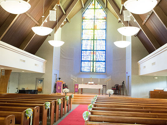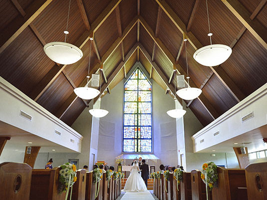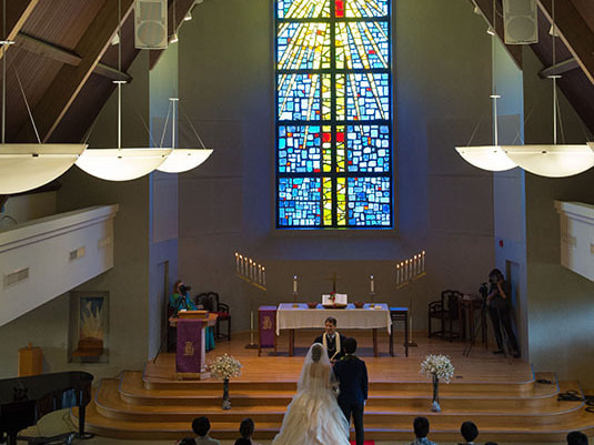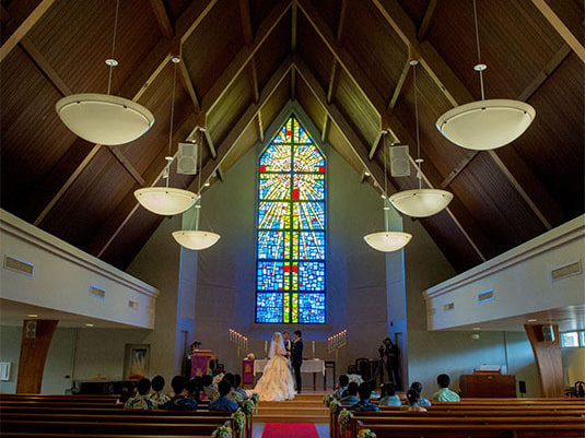 ハワイの太陽と海をモチーフにしたステンドグラスが輝くアットホームで心温まる美しい教会
