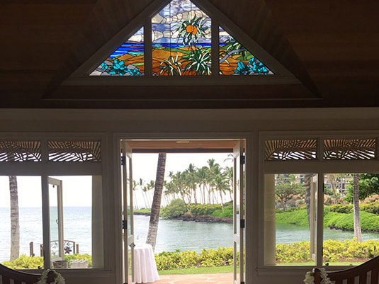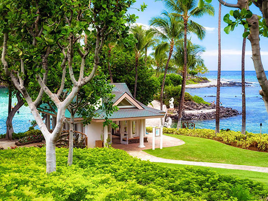 モノレールやボートが走りフラミンゴやイルカなど南国の野生動物たちがいるヒルトン・ワイコロア・ヴィレッジ内に佇む小さなチャペル。海を一望できる場所に建てられ、チャペル内は木のぬくもりに包まれ大きな窓が多いのも特徴。窓からは明るい光と潮の香りがハワイ挙式を演出します。