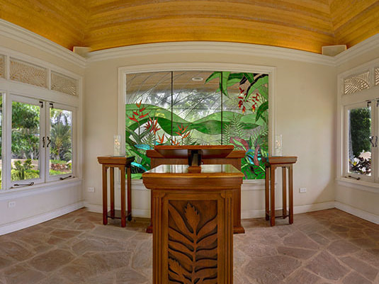 木のぬくもりと南国の様子が描かれているステンドグラスがかわいい海沿いの小さいチャペル